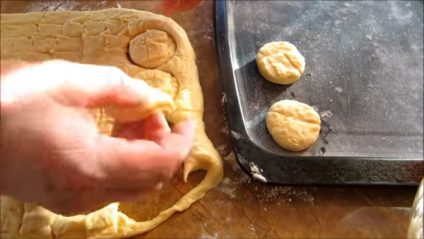 Вырубкой (у меня диаметром 5 см) вырезаем булочки и отправляем на подготовленный противень. Плотно не раскладывайте, еще разойдутся (поднимутся). Смажем булочки яйцом и даем постоять минут 10-15.