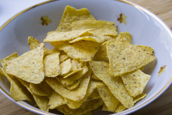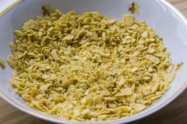 - Кладем кукурузные чипсы в ёмкость, лучше глубокую, а не как у меня.