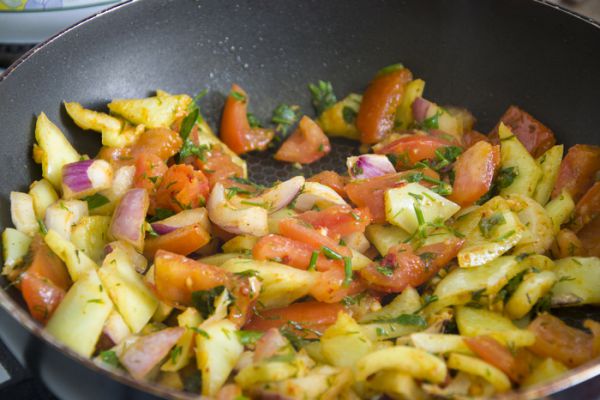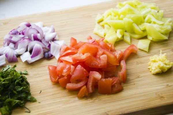 - Нарезаем перец, 3/4 лука, помидоры (без семок) и зелень. Нарезаем довольно крупно, чтобы при жарке потом они у нас в кашу не превратились. Чеснок разотрем в кашу, зелень тоже желательно мелко нарезать.
