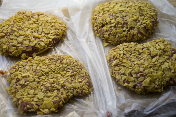 - Формируем котлеты, ну тут ничего нового я вам не скажу. Для разнообразия можно оббить фарш об стол, котлетки получается плотнее. Далее котлеты обваливаем в пострадавших кукурузных чипсах и откладываем мин на 15 в холодильник.
