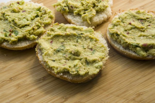 На нижнюю часть булочки мажем гуакамоле, щедрым слоем.