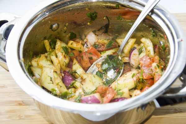 - Закидываем в какую-нибудь кастрюлю овощи, щедро посыпаем специями, добавляем столовую ложку оливкового масла и сок половинки лайма. Все перемешаем и оставляем мариноваться, хотя можно уже и так есть.