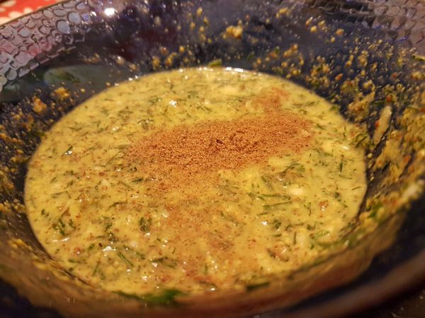 Берём столовую ложку горчицы прям жадно с горкой =) , шинкуем зелень, чеснок тоже помельче, пару щепоток семян перцев или просто острый молотый перец, щепотку сахара, пару щепоток мускатного ореха, выжимаем лимон, душите его как неверную жену в классических хоррорах, чтоб наверняка))) Бонусом получите косточки лимона, если ваши домашние по каким-то вдруг причинам их не едят, то убираем))) Перемешиваем нашу смесь.
