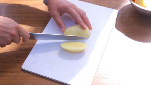 Пока бульон варится у нас есть время заняться овощами. Берем морковь и нарезаем её кружочками. Картофель нарезаем некрупными кубиками. Произвольно, не крупно, нарезаем укроп и петрушку.