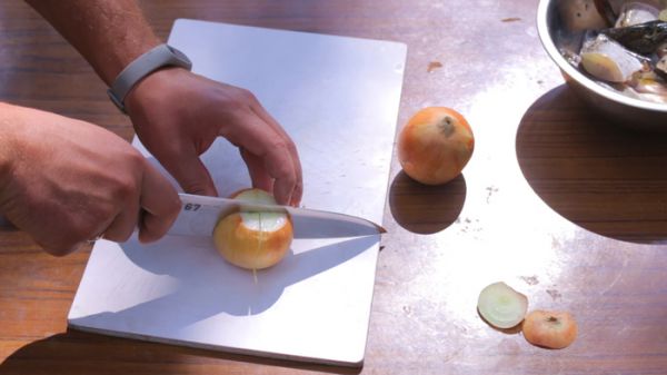 Промываем рыбу и переходим к овощам. Для бульона нам понадобятся 2 луковицы с кожицей. В них необходимо сделать 2 перпендикулярных надреза, не до конца. Отдельно отмечу, что кожицу я оставляю умышленно, она окрасит бульон в очень приятный золотистый цвет.