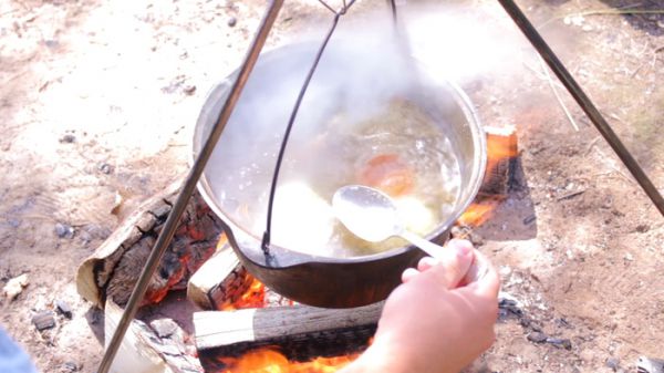 Возвращаемся к котелку. Прошло примерно 40 минут, как мы поставили его на огонь. Рыбный бульон готов и мы смело можем извлечь из него окуней, щучьи головы и хвосты, а так же лук. В бульон опускаем картофель и морковь. Солим. Добавляем черный перец горошком, лавровый лист. Когда картошка будет практически готова отправляем в котелок щуку.