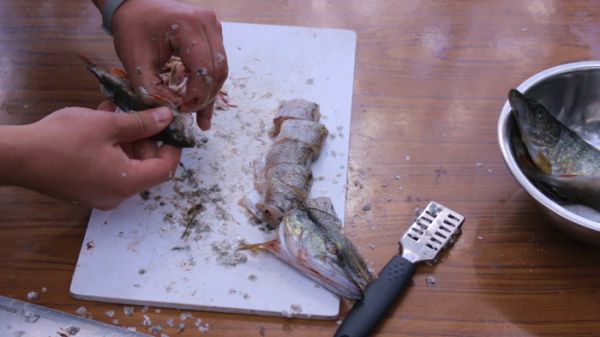 Берем рыбу и очищаем её. В моём случае щуку я буду чистить для еды, а окуни мне понадобятся только для бульона. То есть щуку я избавляю от чешуи, от кишок и жабер. Отрезаю от неё голову и хвост, а тело разрезаю на порционные кусочки. Окуней избавляем от жабер и потрошим.