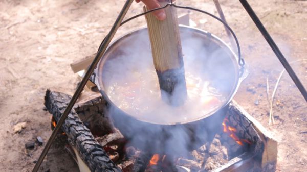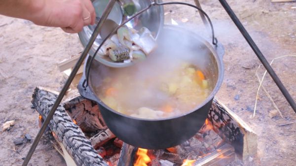 После того как рыба покипит 5 минут, мы превращаем рыбный суп в уху, добавив в него рюмку водки и опустив в него обугленную головешку из костра. Добавляем зелень. Перемешиваем. Уху можно подавать к столу.