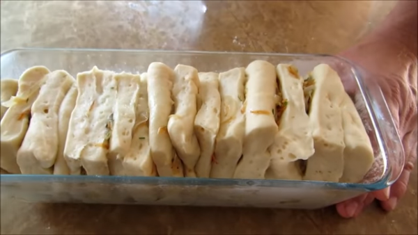 Складываем один на один и выставляем в форму. Накрыв пленкой даем постоять еще минут 10. В это время разогреваем духовку до 180 градусов.