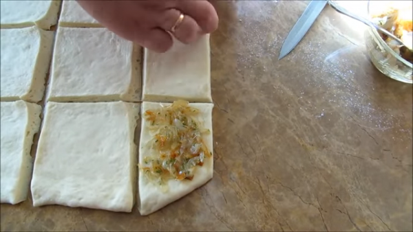 Нарезаем пласт на квадратики размером с вашу форму. На каждую заготовку выкладываем по хорошей ложке лука.