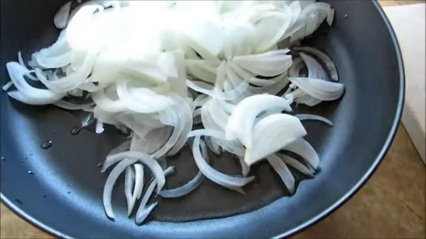 За это время приготовим начинку. Лук тонко порежем соломкой и обжарим до легкой золотистости. В конце добавим мелко порубленный укроп и соль по вкусу. Даем остыть.