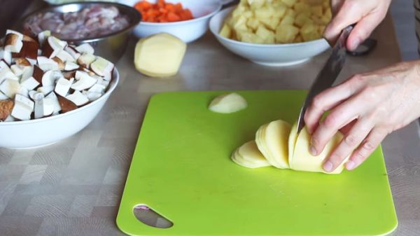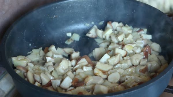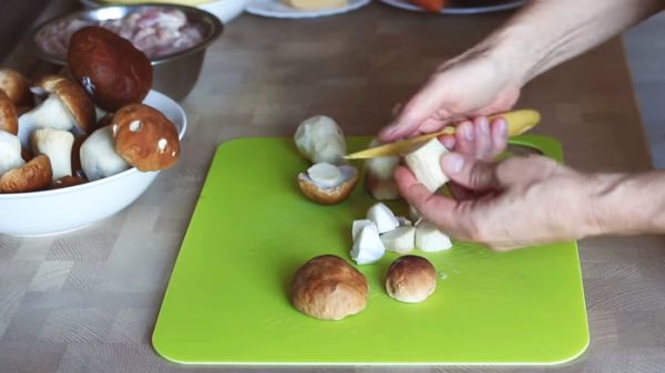 Если готовите с белыми грибами, или рыжиками, просто крупно их нарежьте.