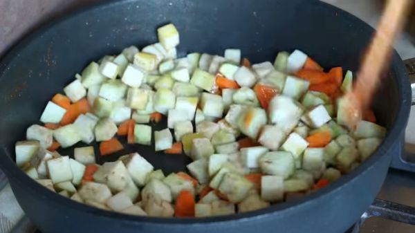 Обжарьте морковь с баклажаном 3 минуты, посолите и разложите следующим слоем поверх грибов.
