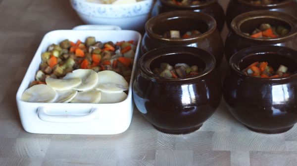 Сверху накройте картофельными пластинами и тушите 30-40 минут под крышками в духовке, разогретой до 200°С.