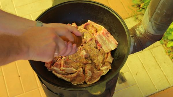Переходим к казану. Все ингредиенты басмы необходимо выложить слоями в холодный казан и только потом развести под ним огонь. На дно казана выкладываем курдючный жир. Он не даст подгореть ингредиентам басмы. Следующим слоем выкладываем баранину. Приправляем её 2ч.л. хмели-сунели, 1ч.л. кориандра, 1ч.л. зиры, предварительно перетерев её между ладонями, чтобы она лучше отдавала свой аромат и свежемолотым перцем.