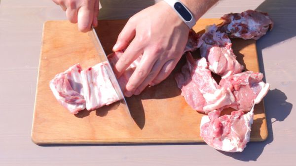 Приготовления басмы я начинаю с мяса. Нам потребуется 2 кг баранины. Очень рекомендую использовать баранину на кости. В моём случае я использовал корейку на кости и бараньи ребра. Разделываем мясо на порционные кусочки. Курдючный жир режем достаточно крупными кусками.