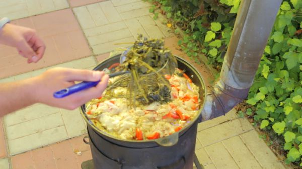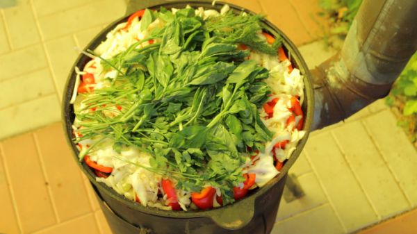 Далее идут слои овощей. Выкладываем лук и равномерно распределяем его по всей поверхности мяса. Следующим слоем выкладываем морковь. Слой моркови требуется присолить. Следом за морковью выкладываем слой помидоров. Их тоже требуется присолить. Вслед за помидорами в казан отправляются баклажаны. Их нужно посолить и приправить сладкой паприкой. Далее выкладываем картофель. Вместе с ним помещаем в казан 3 головки чеснока и острый чили перец. Следующий слой состоит из сладких болгарских перцев. После них в казан отправляется капуста, которую мы промяли с солью. Поверх капусты кладем 1 пуч. укропа, 1пуч. петрушки и 1пуч. базилика. Укрываем содержимое казана капустными листами, которые мы сняли с качана заранее. Закрываем казан крышкой. Ставим на него металлическую мисочку или небольшую кастрюльку дном вверх и кладем на неё груз, чтобы крышка прилегала как можно плотнее к казану.