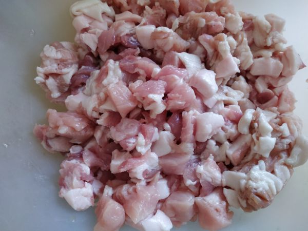 Самое сложное и трудоемкое, Украинская колбаса это кусковая колбаса, ее не пропускают через мясорубку, ее режут на вот такие вот кусочки (заметьте сколько много жира):