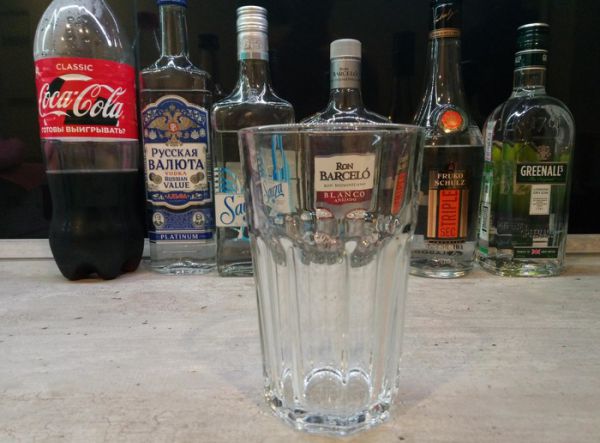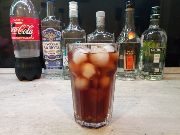 Чтобы соблюдать пропорции алкоголя и колы и чтобы все влезло в бокал, предлагаю лед добавить в самом конце.