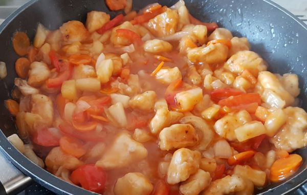 Тем временем мешаем соус. Наливаем в миску кетчуп, уксус, соевый соус, ананасовый сок и растительное масло. Все это дело мешаем с оставшимися двумя столовыми ложками крахмала и сахаром. И отправляем к овощам на сковородку ещё на пару минут. На последней стадии можно отправить туда же мясо, можно просто его при подаче выложить на овощи, тут уж кому как нравится.