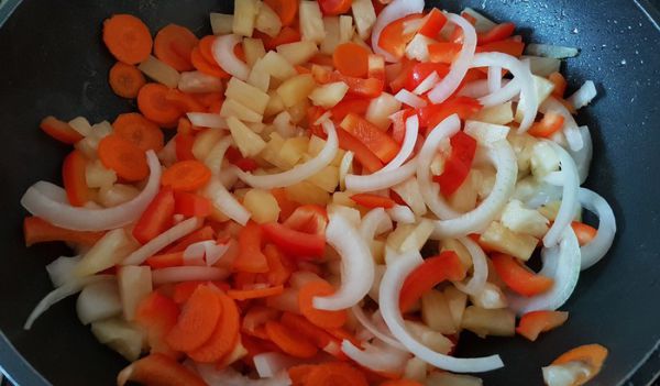 Тем временем наше мясо готово. Выкладываем золотистые кусочки в отдельную тарелку и отставляем в сторону, оно нам ещё пригодится. В ту же сковороду фигачим овощи и обжариваем буквально пять минут. Овощи должны быть хрустящими, не стоит их мучить до состояния каши.