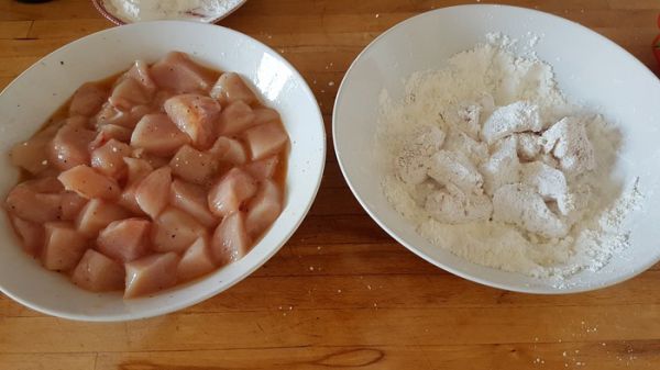 Итак, нарезаем курицу небольшими кусочками и обваливаем в двух столовых ложках крахмала. Затем взбиваем яйцо с солью и перемещаем туда нашу курицу. Ей предстоит быть нещадно вымазанной яйцом. Я перепутала очередность действий и сначала вымочила все в яйце. Но в результате все равно получилось вкусно