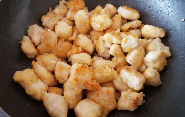 На следующем этапе курица отправляется на раскалённую сковороду или вок с маслом, где обжаривается до готовности. В зависимости от размеров кусочков на это уходит 7- 10 минут.