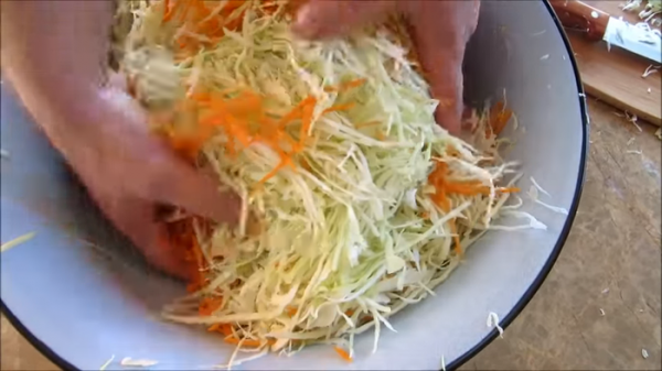 Собираем все в большой чашке, проще будет перемешивать. Добавляем подготовленную соль, слегка (любя) мнем и перемешиваем. Сильно давить капусту ненужно, тогда она останется хрустящей.
