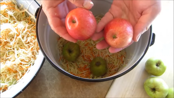 В подготовленную емкость (у нас это эмалированное ведро на 10 л) на дно выкладываем несколько горстей капусты. Потом разложите яблоки, пересыпаем капустой и плотно трамбуем.