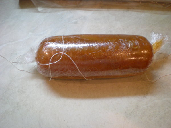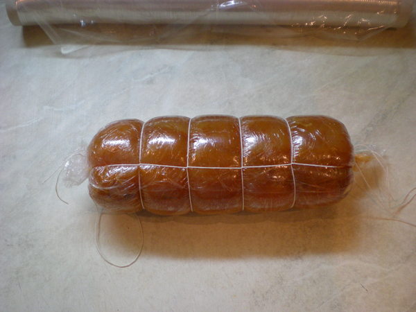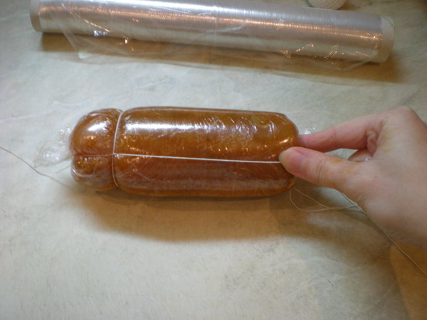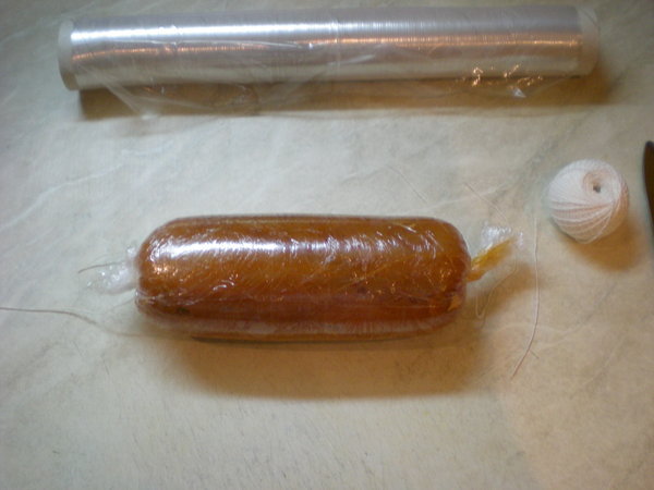 Чтобы наша колбаса сохранила форму (зачем? хз) и никуда не убежала (а вот это уже важно) заплетаем ее в колбасный корсет. Наверное можно и без него, но мне не жалко, пусть будет.