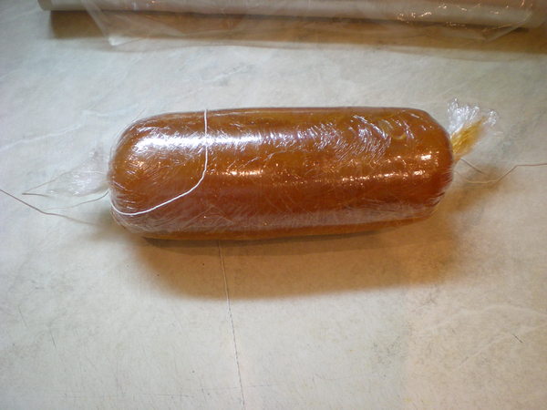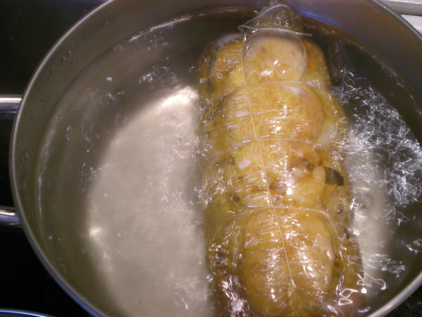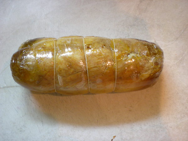 Остужаем обязательно не вскрывая, пусть хоть часть соков впитается обратно. Когда остынет, спускаем из колбасы водицу (она, кстати, вкусненькая, можно использовать ее как бульон) и курица готова к употреблению. В холодильнике хранится дней 5, можно накрутить несколько колбас и заморозить лишние до лучших времён. Только перед варкой их надо будет разморозить.