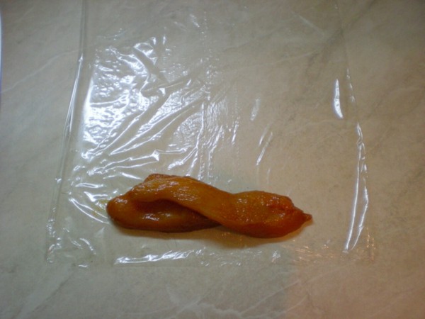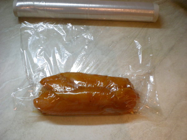 Промариновавшуюся курицу нужно немного посолить (этак четверть чайной ложки соли, помним, что у нас там уже соленый соевый соус) и заново хорошо перемешать. До маринования мы ее не солили, чтобы соль не вытянула из нее влагу. Дальше из курицы будем крутить колбасень. Выкладываем курицу на пленку, оставив по бокам пленку для хвостиков. Стараемся чтобы колбаса везде была одинаковой толщины и чтобы волокна курицы были вдоль колбасы, чтобы нарезали мы ее потом поперек волокон.