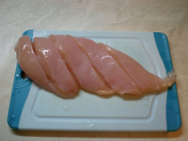 Итак, режем курочку. Стараемся нарезать вдоль волокон на полоски 2см² в сечении.