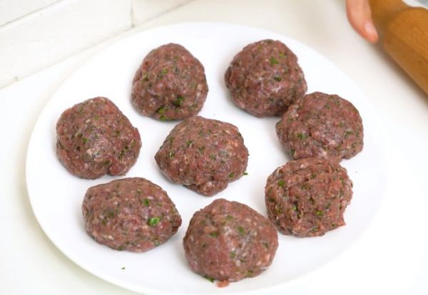 Из теста и фарша сформировать по 8 шариков (вес шарика теста у меня вышел 60 гр, а мяса – 70 гр)