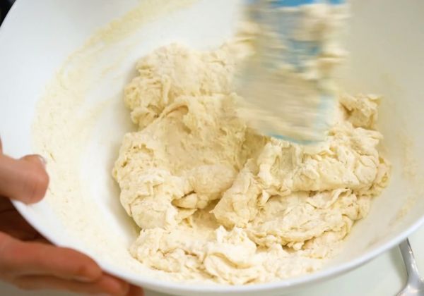 Сначала в кефир добавляю и соду и оставляю минут на 5, чтобы они подружились и между ними произошла реакция. В кефир добавляю соль и частями ввожу муку. Нужно не переборщить с мукой, тесто должно остаться мягким и слегка липким, вымесить тесто минут 5-7. Оставить на 30 минут, чтобы тесто отдохнуло, клейковина набухла.