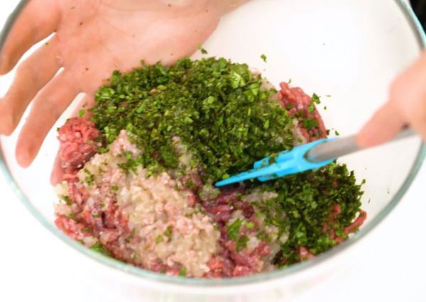 На мясорубке перемолоть мясо, лук. Мелко измельчить зелень кинзы и мяты, добавить к фаршу, посолить, поперчить и перемешать.