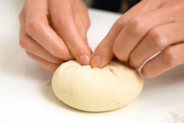 Раскатать немного шарик теста, положить в центр шарик фарша, скрепить сверху. Оставить на 10 минут.