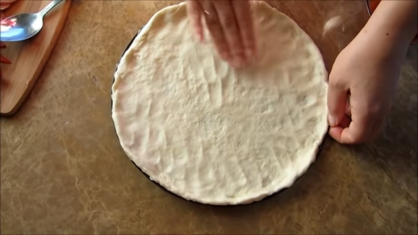 Выкладываем на подготовленный лист (у меня дно от разъемной формы диаметром 27 см), выравниваем и формируем небольшие бортики.