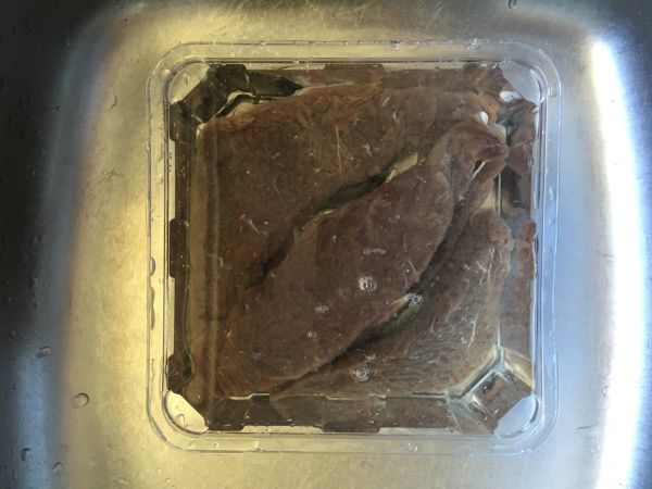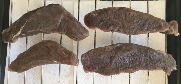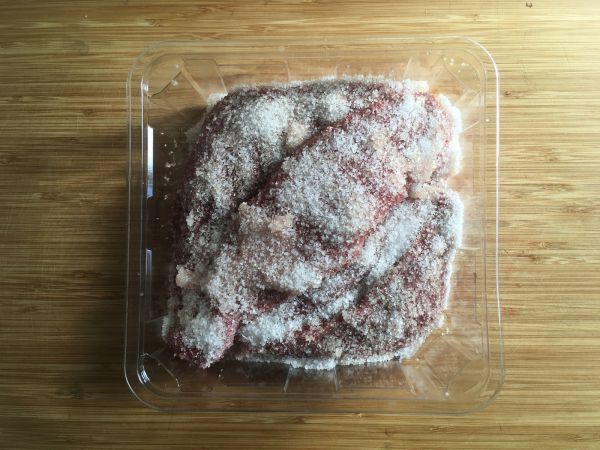 Через три дня вытащил будущую бастурму из холодильника. Отмачивал в течении 5 часов, периодически меняя воду, чтобы удалить излишки соли. Промокнул салфетками и оставил сушиться на 2 дня.