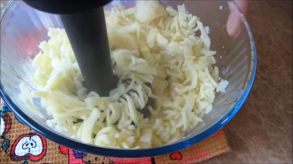 За это время приготовим начинку. Картофель отвариваем, лук порезанный кубиком обжариваем в небольшом количестве масла. Картошечку измельчаем любым удобным для вас способом, добавляем обжаренный лучок.
