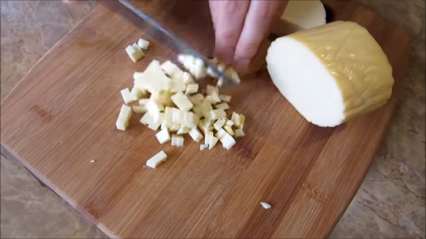 Копченный сыр (колбасный) режем кубиком и добавляем в остывший картофель. Мне кажется сюда отлично подойдет и сыр чечил (копченая косичка).