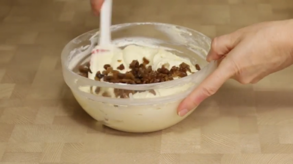 Залить изюм теплой водой на полчаса, обсушить и порубить ножом.
