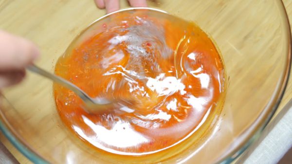 Перейдем к приготовлению маринада. В глубокую миску наливаем 300мл. холодной воды. Пропускаем кусочки перца Чили через пресс для чеснока, чтобы он выделил в воду как можно больше капсаицина. Добавляем 2 ст.л. растительного масла, 1ст.л. красного острого перца, 1 ч.л. молотого имбиря, а так же немного черного свежемолотого перца, примерно 1 ч.л. Перемешиваем маринад.