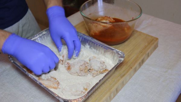 Достаём куриные крылья из холодильника и приступаем к их панировке. Важно, чтобы вся поверхность каждого крыла была покрыта слоем панировки. Поэтому не стесняемся и, как следует, обволакиваем крылья приготовленной смесью. При помощи дуршлага опускаем крылья покрытые панировкой в кастрюлю с водой. Ждём пока поднимутся на поверхность все пузыри воздуха. Извлекаем крылья и даём лишней воде стечь. Возвращаем крылья в панировочную смесь. Повторяем процедуру панировки второй раз.