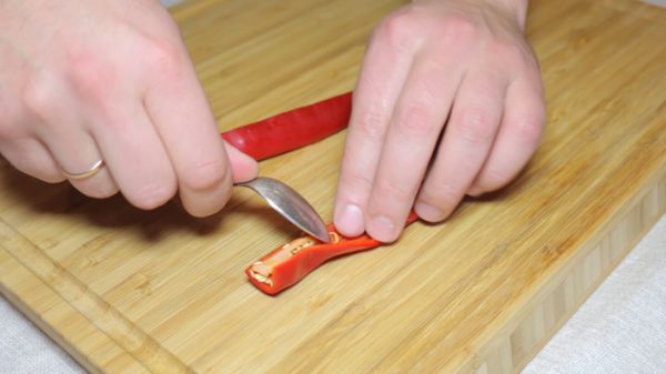 Разрезаем Чили перец на 2 части. При помощи ложки удаляем из него все семена. Нарезаем на достаточно крупные кусочки из расчета, что они должны будут поместиться в пресс для чеснока.