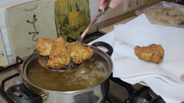 Ставим кастрюлю на плиту. Наливаем в неё 2 л. масла. Хорошо его разогреваем. Аккуратно опускаем в раскаленное масло кусочки курицы в панировке. Будьте аккуратны, не обожгитесь! Оставляем крылья готовиться во фритюре на 6 минут. В конце указанного времени извлекаем крылья из кастрюли и выкладываем их на бумажные полотенца, чтобы они впитали весь лишний жир.