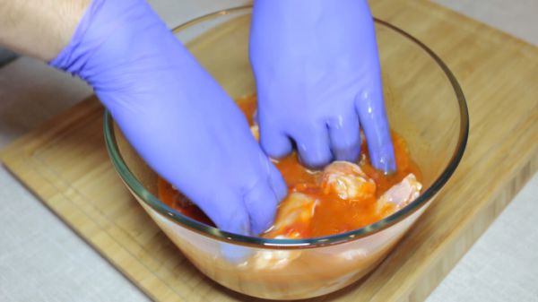 Опускаем крылья в маринад. Очень рекомендую делать это в перчатках. Как следует, перемешиваем содержимое миски, чтобы маринад равномерно обволакивал куриные крылья. Оставляем их мариноваться на 12 часов в холодильнике.