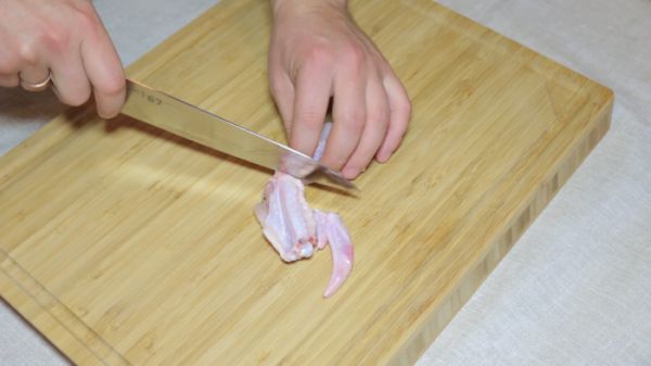 Приготовление крыльев, как это логично предположить, я начинаю именно с крыльев. Крыло состоит из 3 фаланг. Делить мы его будем по суставам. При этом самая маленькая часть крыла в приготовлении участвовать не будет. Чтобы разделить крыло на фаланги надо сделать надрез с внутренней стороны сустава и вывернуть его в обратную сторону. Затем вставить нож между костями и прорезать крыло до конца. Разделываем таким образом все имеющиеся у нас крылья.