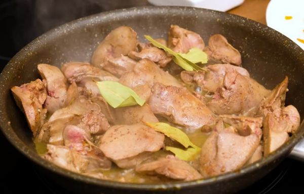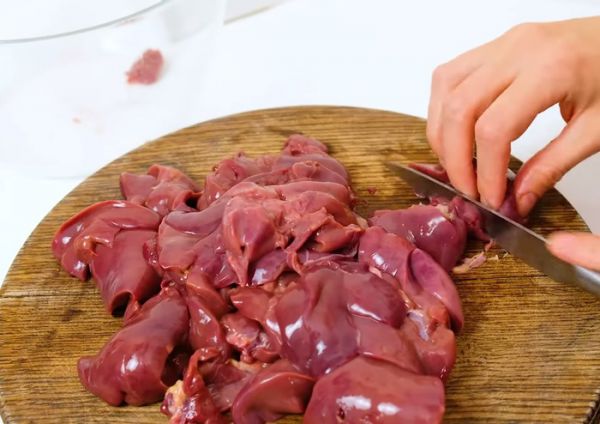 Печень хорошо промываем, просушиваем бумажными полотенцами и нарезаем пополам