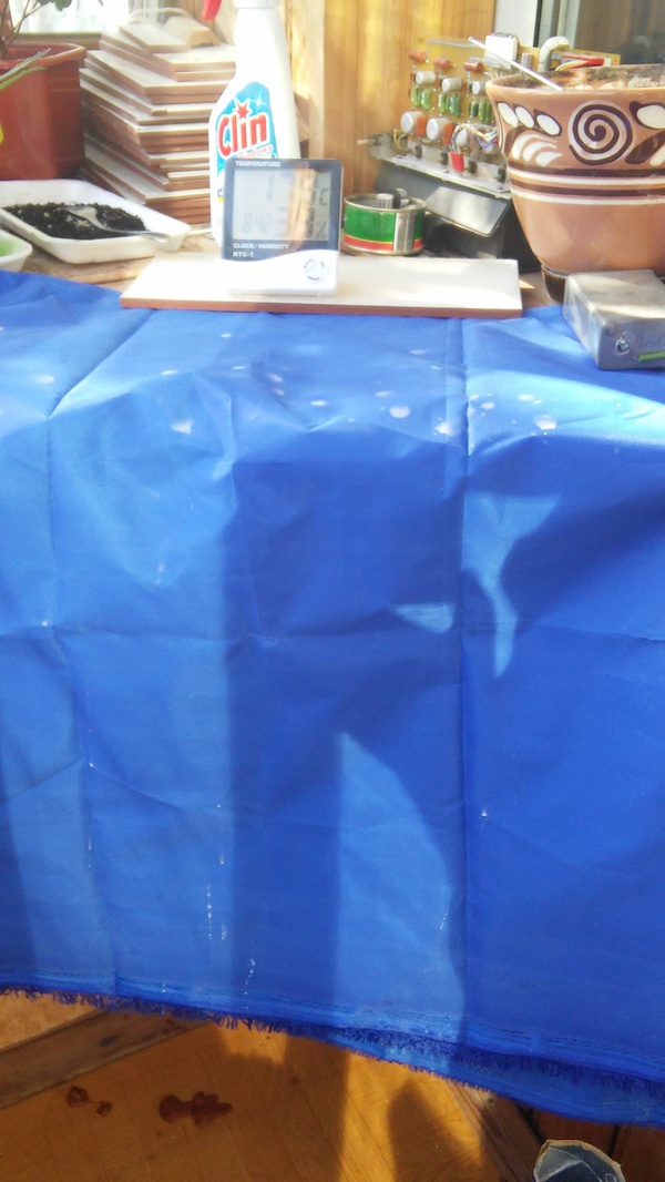 Как я уже говорил, вялил мясо я на балконе. Обертывать мясо марлей не обязательно. Насекомых еще не было, а обмазка достаточно неплохо защищает мясо. Сверху накрыл тканью для защиты от сквозняка и света.